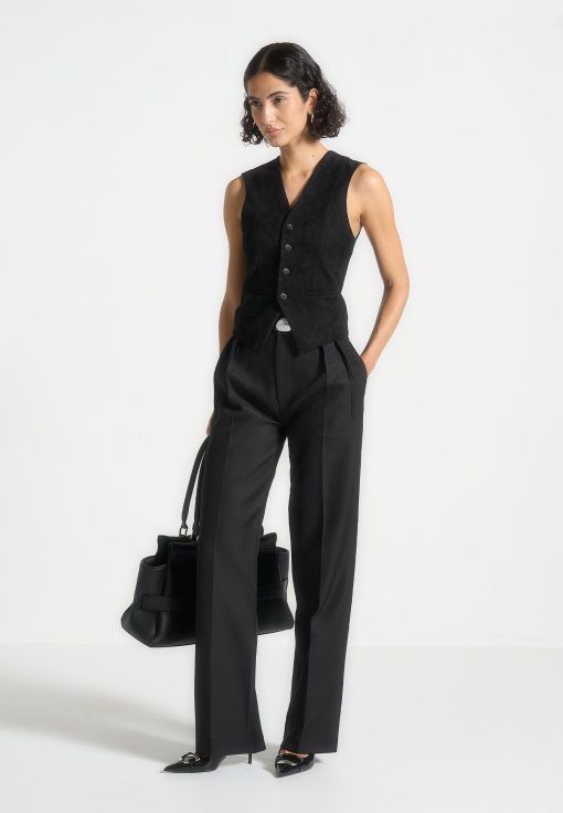 These trousers feature twin pleats and a straight leg, creating a relaxed and comfortable fit. The straight leg fit and pleat detail give a polished, tailored look, perfect for any occasion from day to night. The mid-rise waist flatters the figure creating a classic and timeless look.
