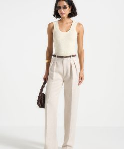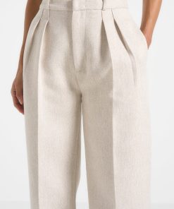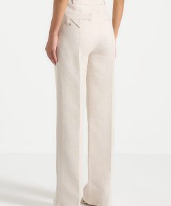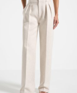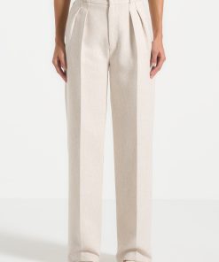 These tailored twin pleat trousers are a refined wardrobe essential, offering a timeless silhouette with elevated detailing. Crafted from premium suiting fabric, they feature twin front pleats that enhance the structured drape, a straight-leg cut for elongated proportions, and sharp creases for a polished finish. Discreet side pockets and distinctive back welt pockets with angular flap detailing complete the look, while the light beige tone lends a soft, versatile base to both casual and smart styling.