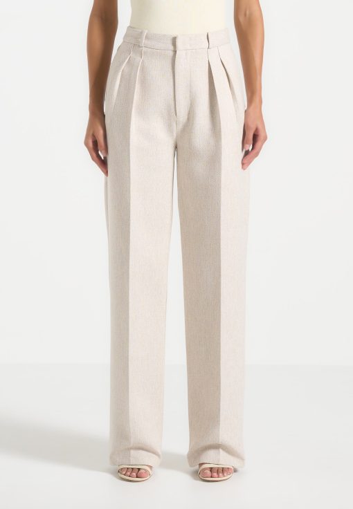 These tailored twin pleat trousers are a refined wardrobe essential, offering a timeless silhouette with elevated detailing. Crafted from premium suiting fabric, they feature twin front pleats that enhance the structured drape, a straight-leg cut for elongated proportions, and sharp creases for a polished finish. Discreet side pockets and distinctive back welt pockets with angular flap detailing complete the look, while the light beige tone lends a soft, versatile base to both casual and smart styling.