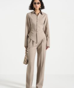 - High-rise waist with structured waistband and belt loops