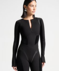 Crafted with a combination of vegan leather and suede, this black jumpsuit is designed to enhance your figure with its contoured silhouette. Perfect for any occasion, it offers both style and comfort. Upgrade your wardrobe with this unique piece.