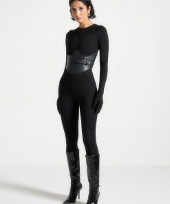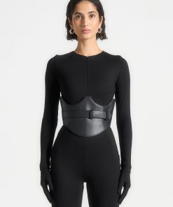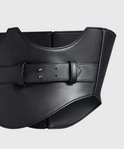 This Black Vegan Leather Corset Belt features a striking belt detail and a sophisticated dipped hem design. Made from high-quality vegan leather, it enhances any outfit with its sleek, modern style. Elevate your look with this cutting-edge accessory.