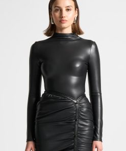 This beautiful and sleek Vegan Leather Mock Neck Bodysuit is perfect for a stylish look. It features a high neck and long sleeves, ensuring maximum comfort and coverage. Crafted from premium grade vegan leather, this bodysuit is sure to make you stand out.