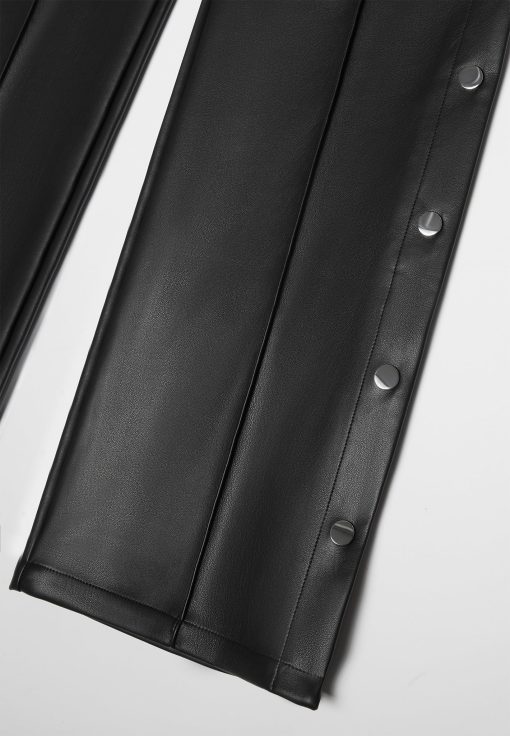 These Vegan Leather Pintuck Popper Trousers will ensure a trendy and modern look. Featuring a wide leg and a high waist, the trousers create an eye-catching silhouette that flatters your figure. Crafted with quality leather for a luxurious feel and timeless look, these trousers are essential for your wardrobe.