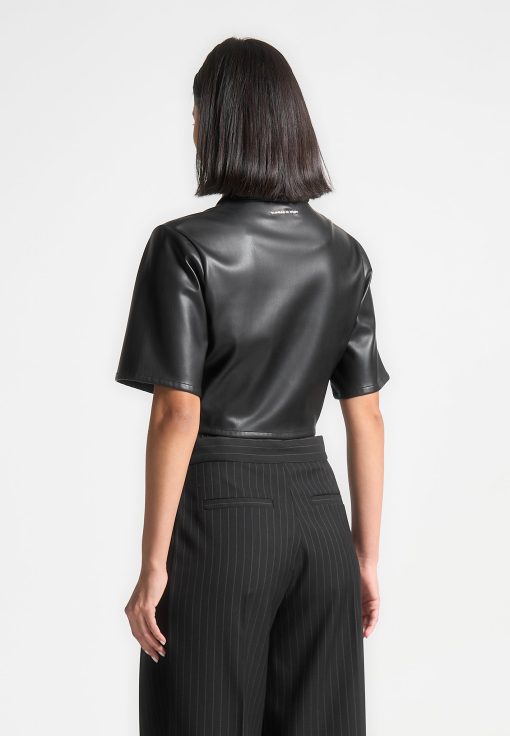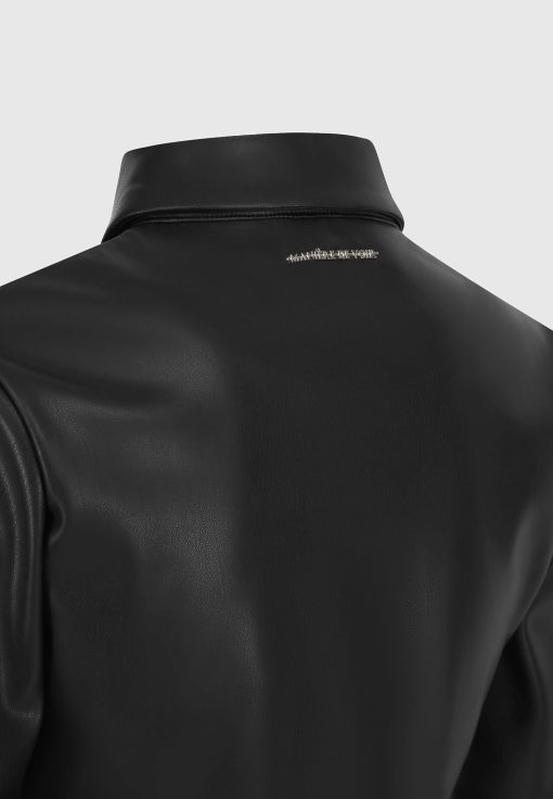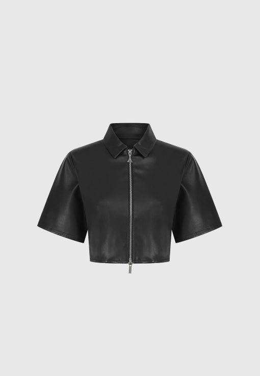 Our Cropped Leather Shirt in black is crafted with a loose fit and soft fabric and features a double zip for optimal comfort. Its unique design offers a stylish and fashionable look that can be dressed up or down.