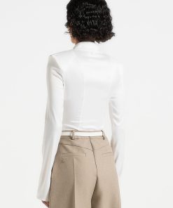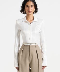This sleek bodysuit offers a refined take on classic shirting with a polished, tailored finish. Crafted from lustrous satin, it features a structured pointed collar, clean front seam detailing, and a buttoned placket for a crisp, elevated look. The long sleeves are designed with subtle flare and split cuffs, introducing a modern twist to a timeless silhouette. Rendered in an elegant off-white tone, this piece brings sophistication and fluidity to both professional and evening ensembles.