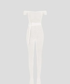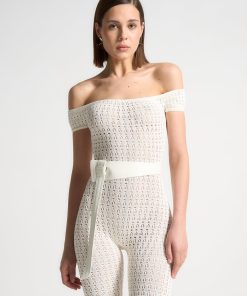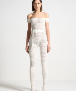 Crafted from high quality pointelle knit, this bardot jumpsuit offers a figure-flattering silhouette with its stretch fabric. Perfect for any occasion, the attached belt adds a touch of elegance to this unique and fashion forward piece.