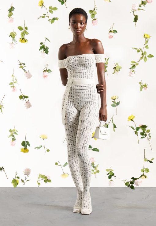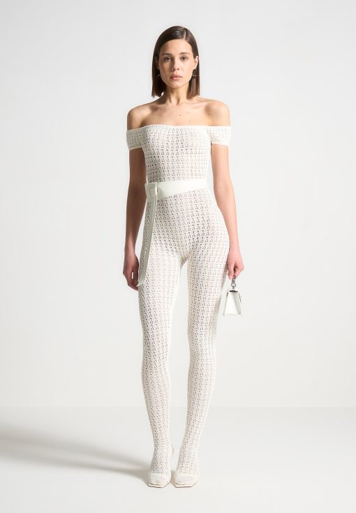 Crafted from high quality pointelle knit, this bardot jumpsuit offers a figure-flattering silhouette with its stretch fabric. Perfect for any occasion, the attached belt adds a touch of elegance to this unique and fashion forward piece.