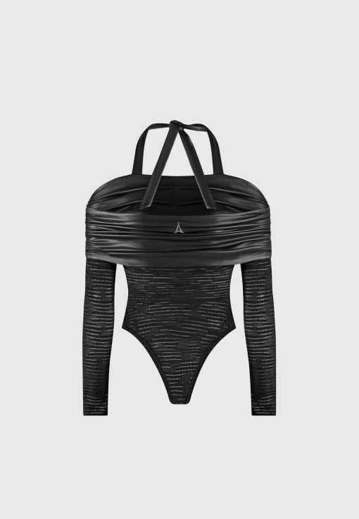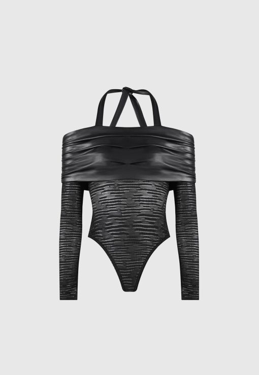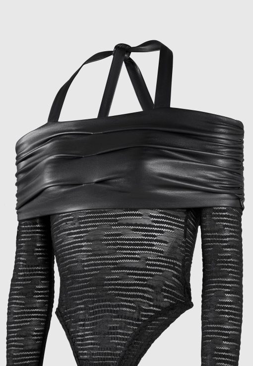 This Mesh and Vegan Leather Bardot Bodysuit is perfect for your next night out. This bodysuit features a unique halter neckline with vegan leather detailing, providing a stylish and eye-catching look. The breathable mesh fabric will keep you comfortable while the form-fitting design ensures you’ll look your best. Make an impression the next time you dress to impress.