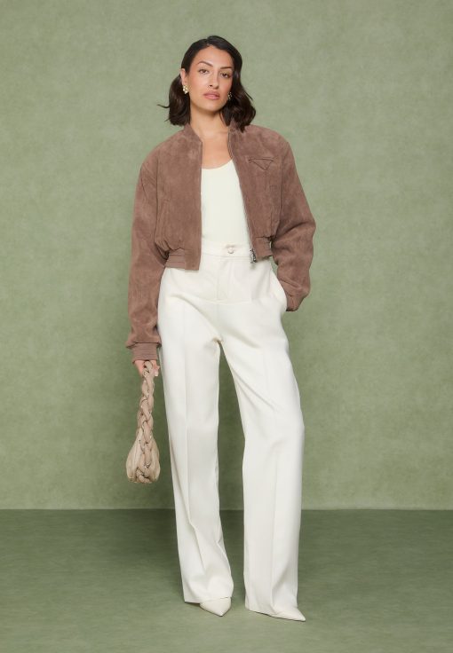 Refine your wardrobe with our Suede Wide Shoulder Bomber Jacket. Crafted from premium vegan suede, it features an elasticated hem for a tailored fit, faux welt pockets for a polished look, and a double-ended zip for added versatility. A perfect balance of modern functionality and timeless sophistication.