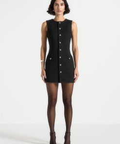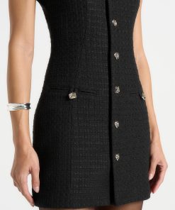 Crafted in a sophisticated woven tweed, this tailored mini dress blends texture and structure. Detailed with textured silver button accents and darted at the waist for a flattering fit, this dress is finished with a smooth satin lining for added comfort.