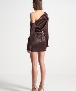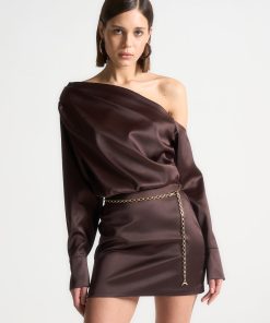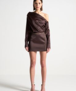 Elevate your wardrobe with our Off Shoulder Draped Satin Mini Dress with Belt. Featuring drape detailing and an asymmetric neckline, this dress exudes sophistication and style. Complete the look with the included chain belt for a flattering fit. Expertly crafted for a polished, modern look.