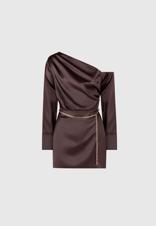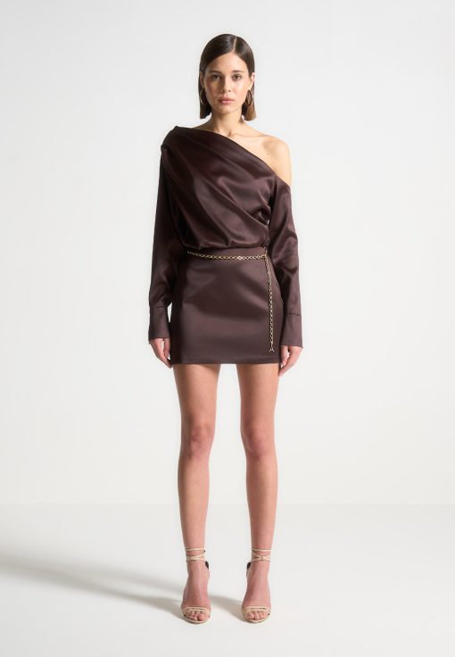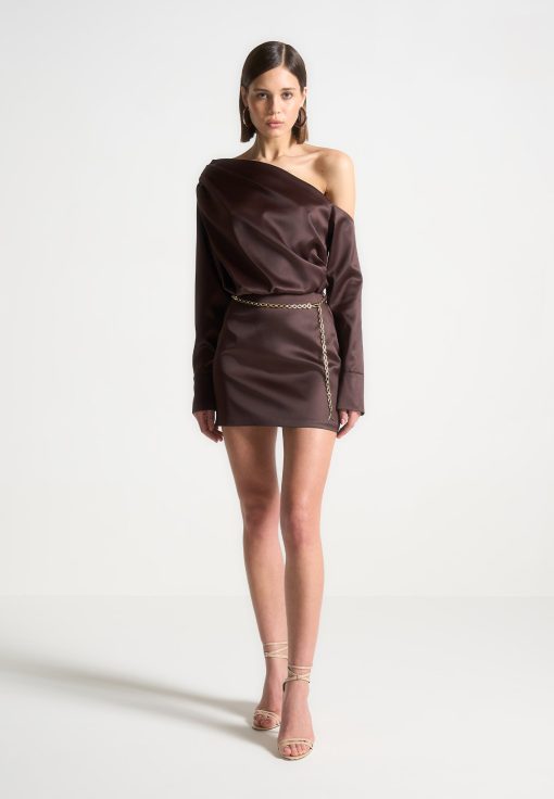 Elevate your wardrobe with our Off Shoulder Draped Satin Mini Dress with Belt. Featuring drape detailing and an asymmetric neckline, this dress exudes sophistication and style. Complete the look with the included chain belt for a flattering fit. Expertly crafted for a polished, modern look.