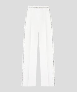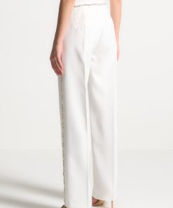 Expertly tailored for a perfect fit, these white trousers feature glamorous detailing and a sharp crease down the front leg for a sophisticated look. Elevate your wardrobe with these elegant trousers that offer comfort and style in equal measure.