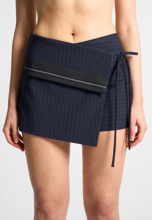 This Pinstripe Mini Skort offers a unique take on a classic design. Crafted with manipulated tailoring, this skort creates a modern look that is sure to be a stunning addition to any wardrobe.
