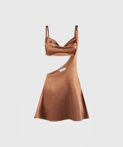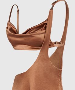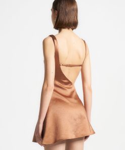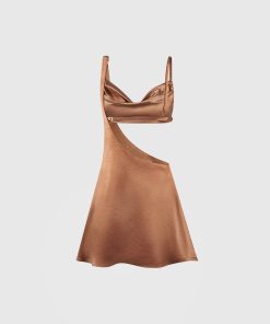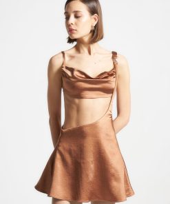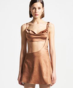 Make a statement in this Satin Bralette Fluted Mini Dress. The drape front bralette and curved waistline give a flattering fit, while the skirt and adjustable straps offer movement and comfort. Perfect for a night out or special occasion, this dress will have you feeling confident and feminine.
