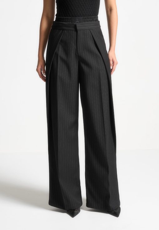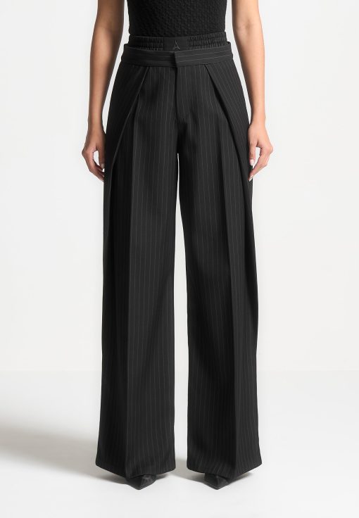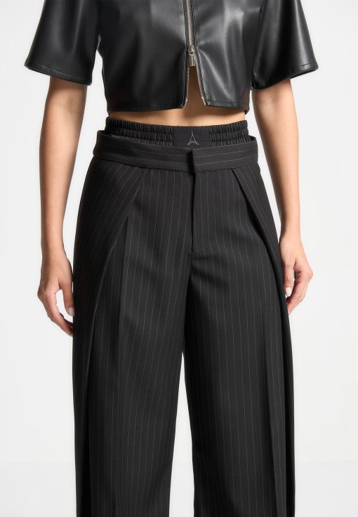Expertly designed for versatility, these Satin Waistband Pinstripe Trousers are a must-have for any wardrobe. Featuring a double waistband and wide leg, these trousers offer a flattering fit and can be dressed up or down for any occasion. Sleek and stylish, these trousers are a timeless addition to your wardrobe.