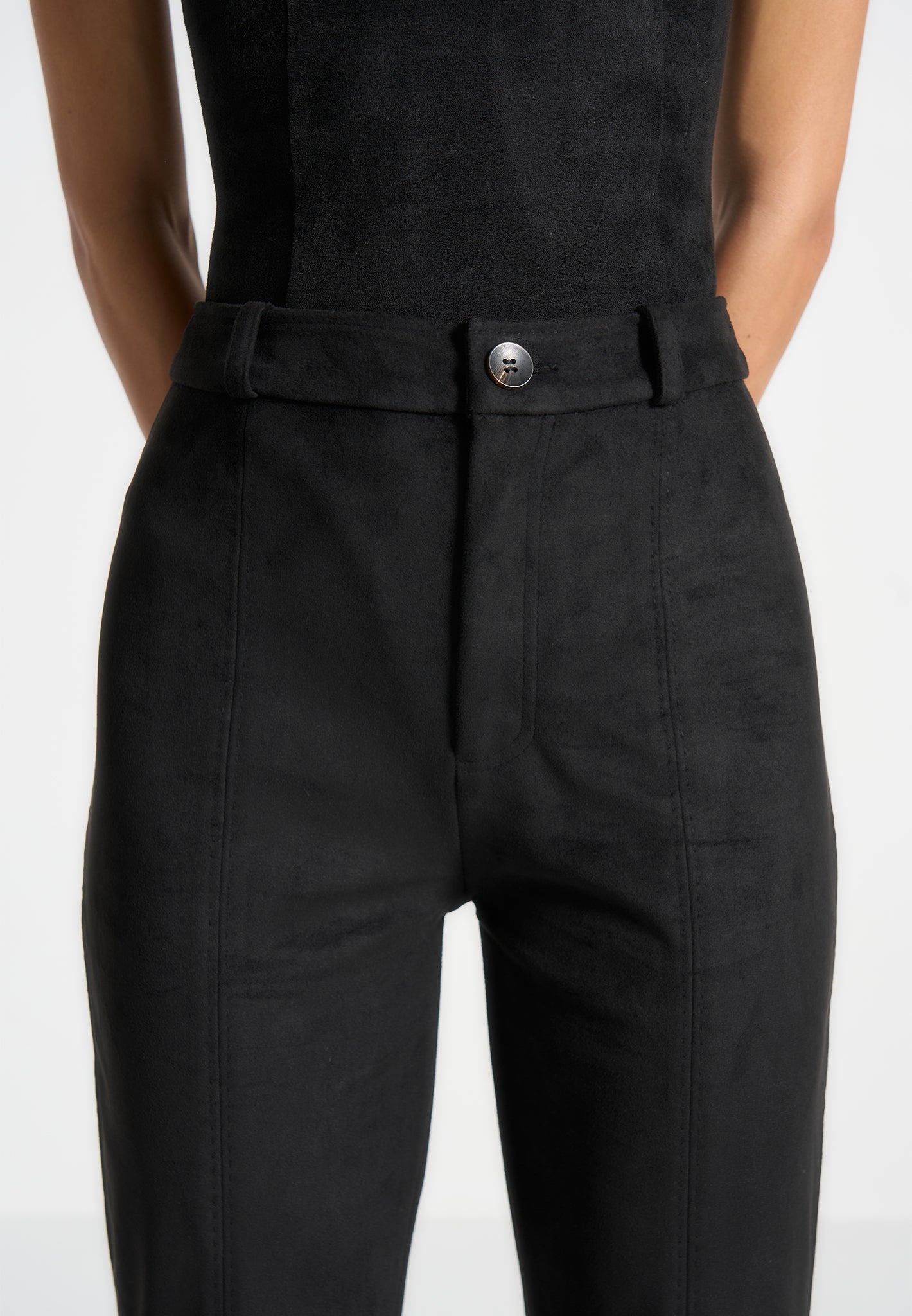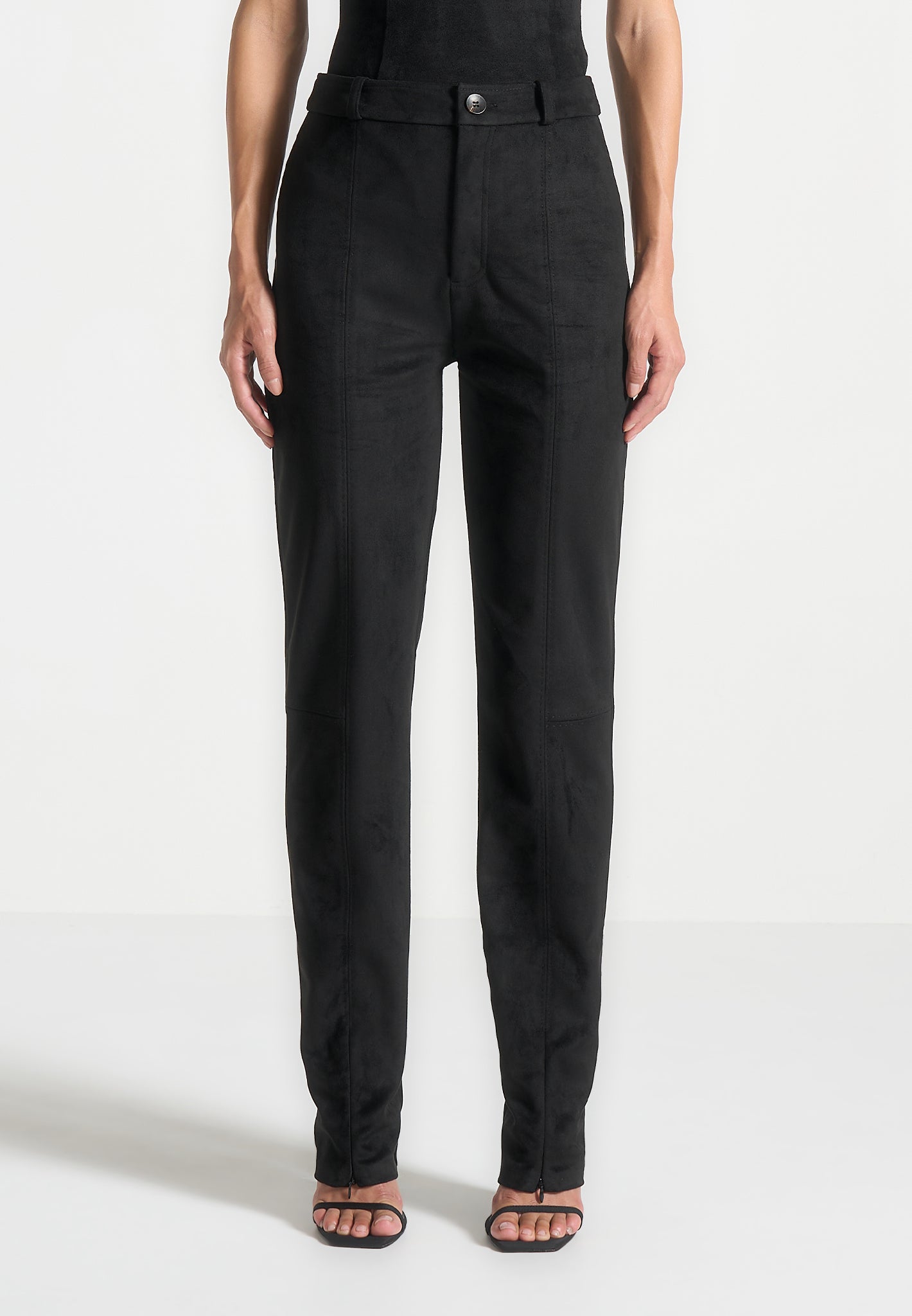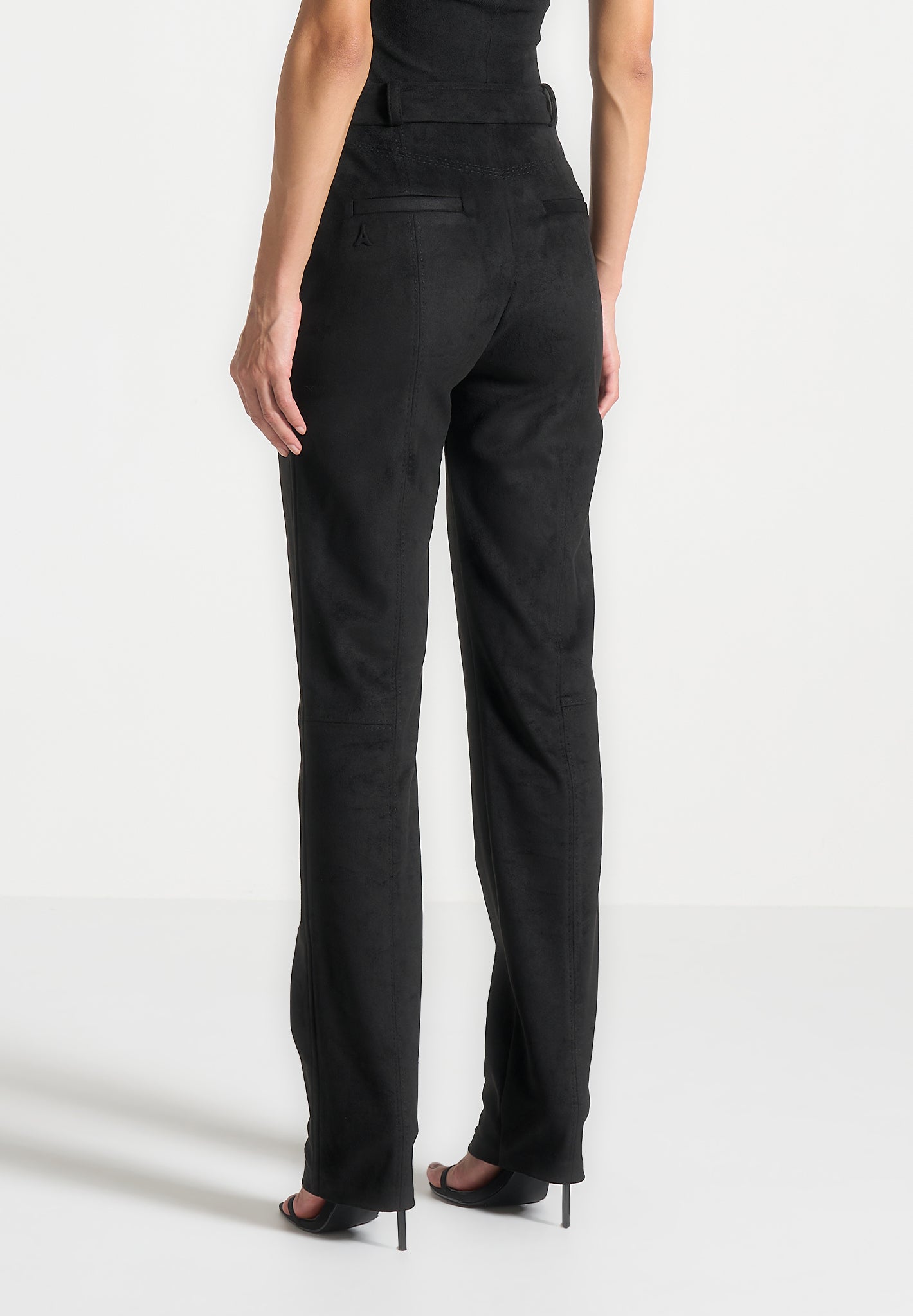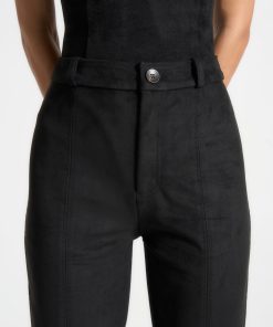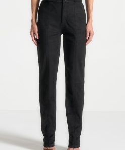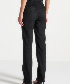 Expertly crafted from soft suede, these black trousers feature a split hem and topstitching detailing for a polished finish. With a straight leg silhouette, they offer a classic and sophisticated look, perfect for any occasion. Elevate your wardrobe with these versatile trousers that exude both comfort and style.