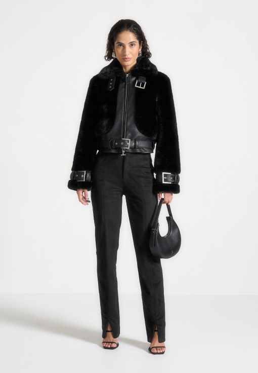Expertly crafted from soft suede, these black trousers feature a split hem and topstitching detailing for a polished finish. With a straight leg silhouette, they offer a classic and sophisticated look, perfect for any occasion. Elevate your wardrobe with these versatile trousers that exude both comfort and style.