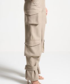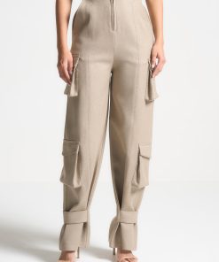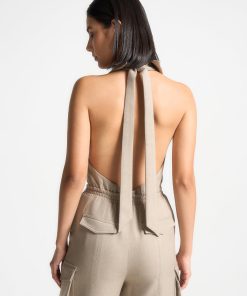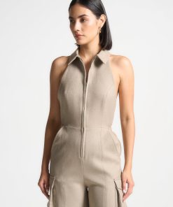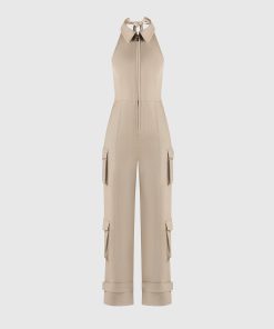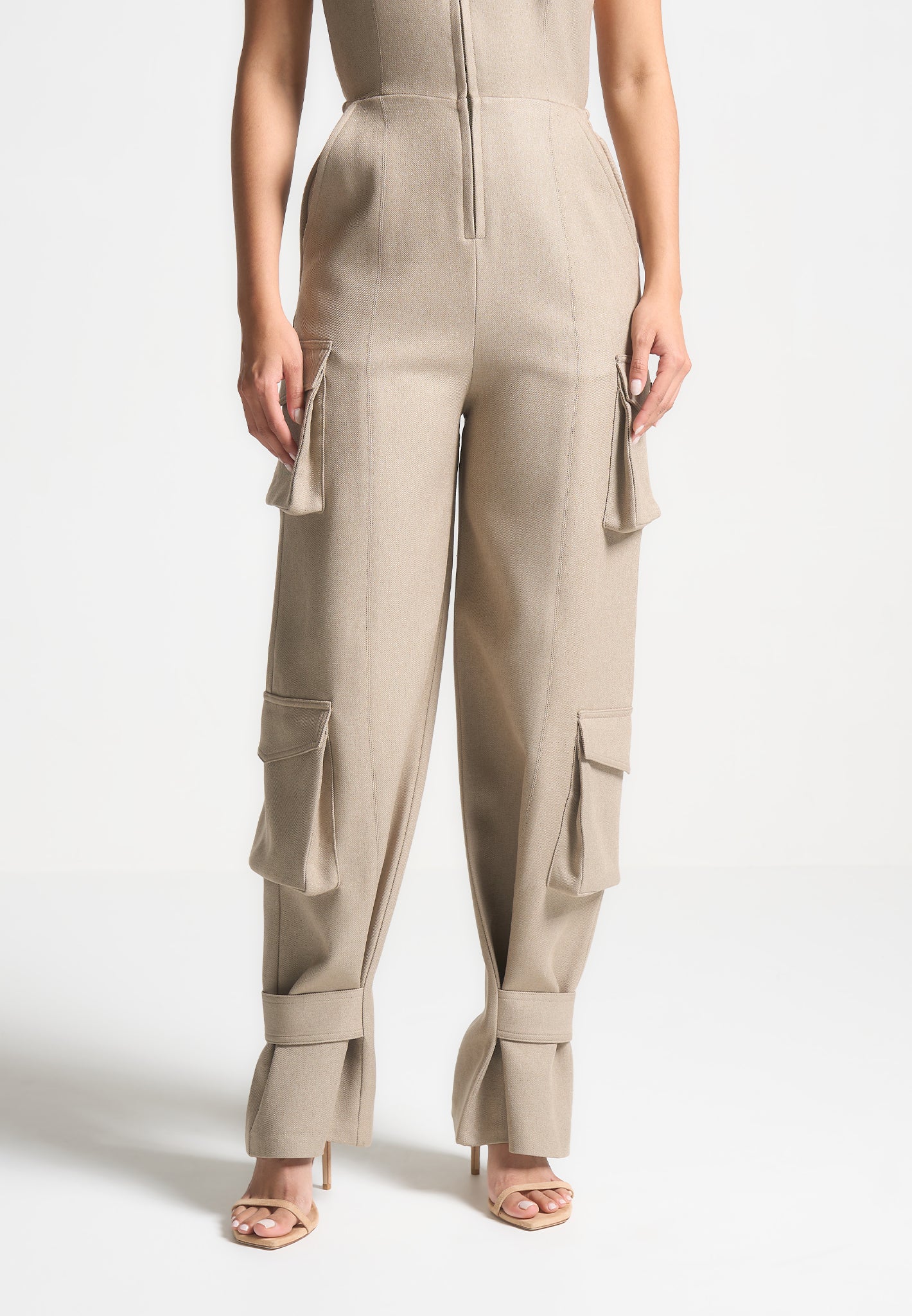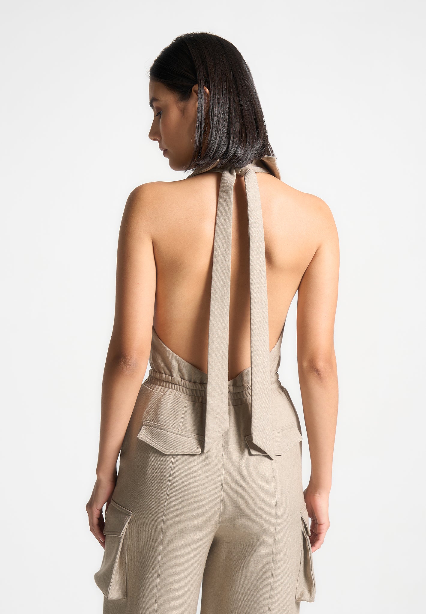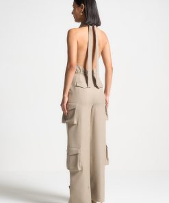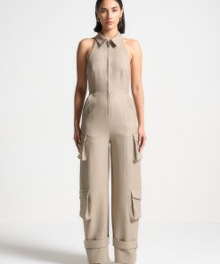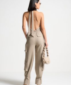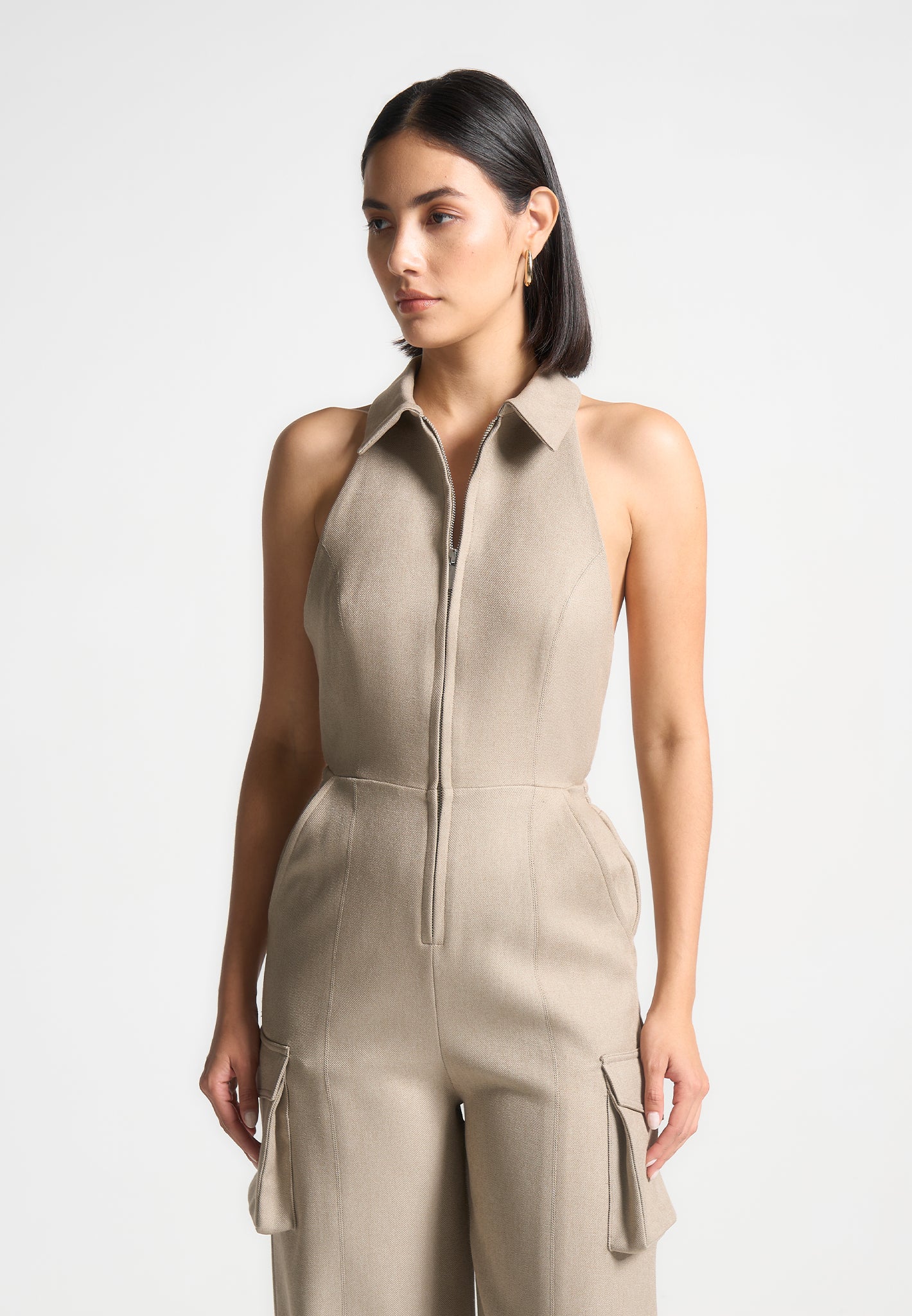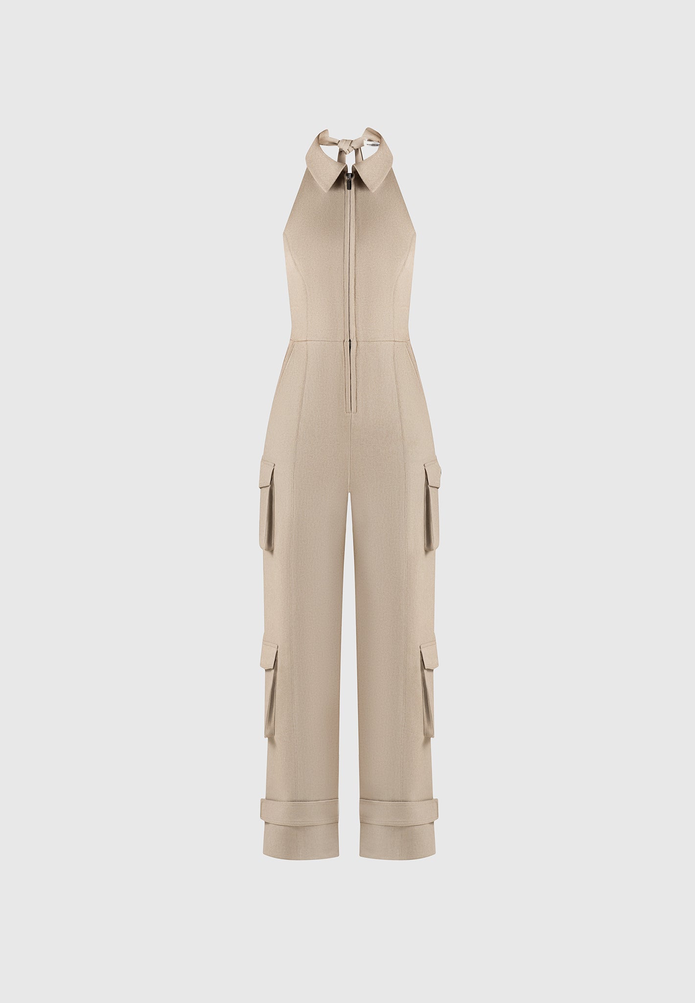 This Tailored Halterneck Cargo Jumpsuit in beige is the perfect blend of form and function. With cargo pockets and leg straps, you can easily store your essentials while keeping your hands free. The tie neck adds a stylish touch and allows for a customised fit. Stay effortlessly chic in this jumpsuit.