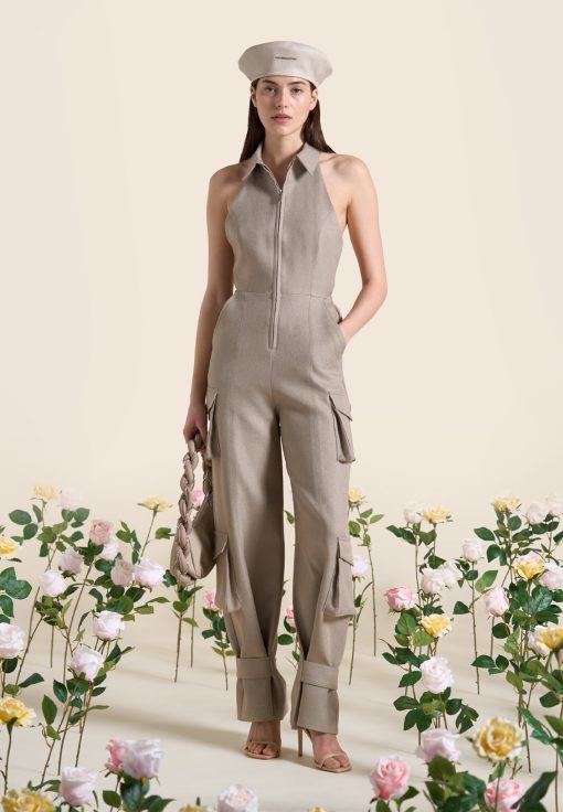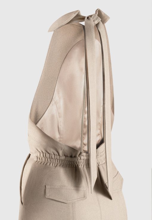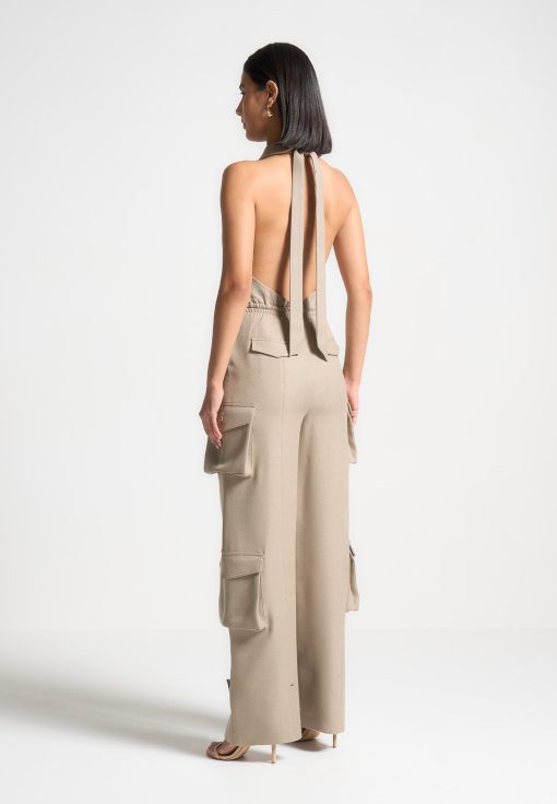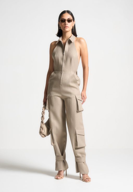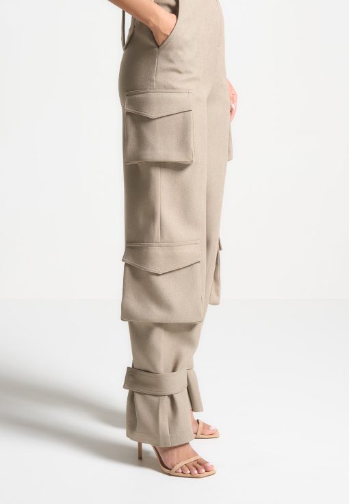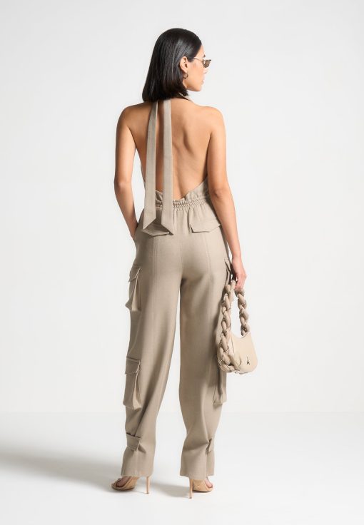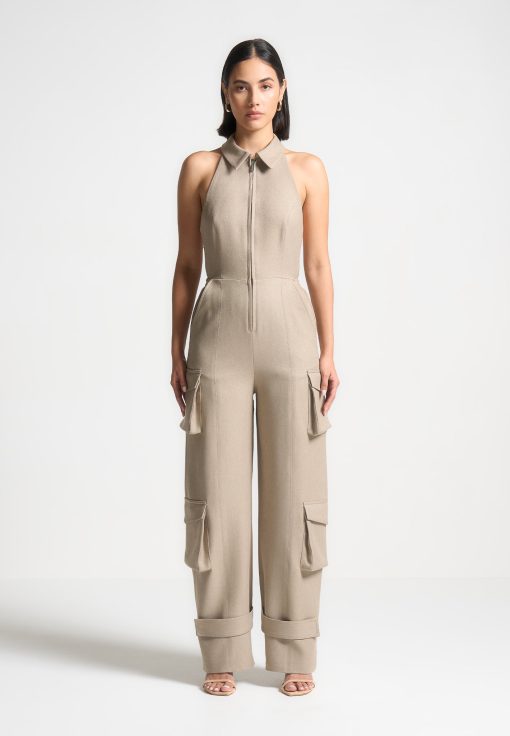 This Tailored Halterneck Cargo Jumpsuit in beige is the perfect blend of form and function. With cargo pockets and leg straps, you can easily store your essentials while keeping your hands free. The tie neck adds a stylish touch and allows for a customised fit. Stay effortlessly chic in this jumpsuit.