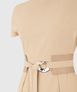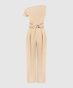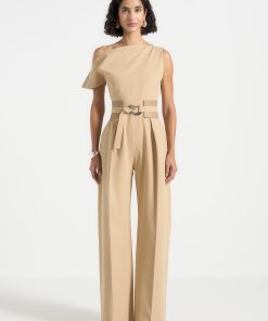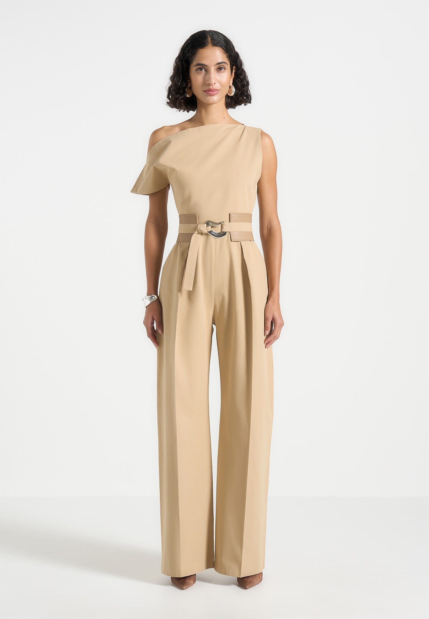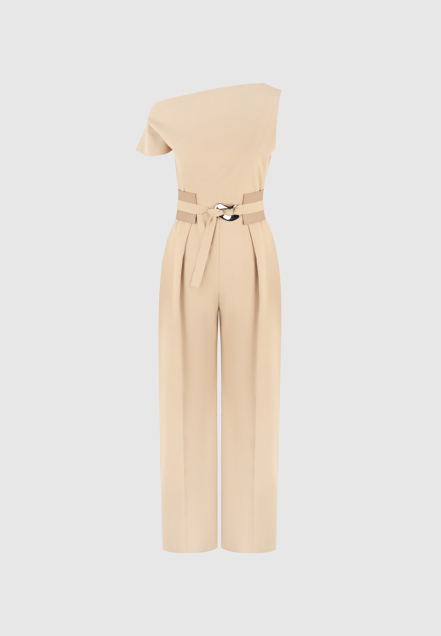 Striking the balance between structure and softness, this asymmetric jumpsuit delivers modern tailoring with a twist. Featuring a one-shoulder neckline and clean lines through the bodice, the design is anchored by a wide-leg silhouette and a sculpted waist. The detachable belt, finished with metallic hardware, enhances the fit while adding a statement focal point. Crafted from structured cotton fabric, it’s a polished all-in-one piece made for elevated dressing.
