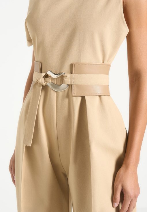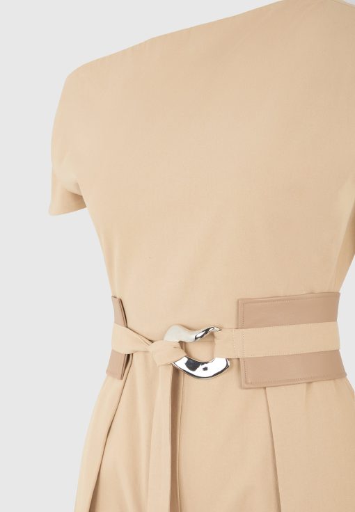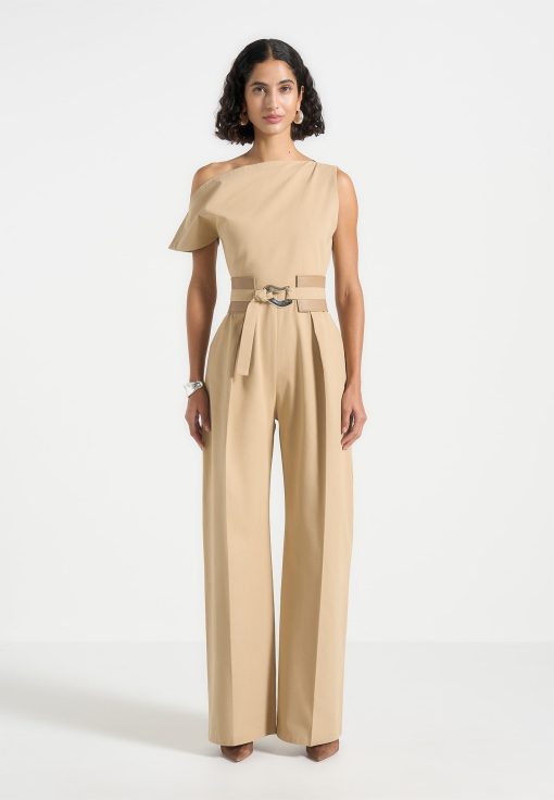 Striking the balance between structure and softness, this asymmetric jumpsuit delivers modern tailoring with a twist. Featuring a one-shoulder neckline and clean lines through the bodice, the design is anchored by a wide-leg silhouette and a sculpted waist. The detachable belt, finished with metallic hardware, enhances the fit while adding a statement focal point. Crafted from structured cotton fabric, it’s a polished all-in-one piece made for elevated dressing.