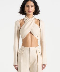This natural linen bolero top combines the classic halter neck style with a modern, on trend sleeve overlay. Perfect for any occasion, this top is both chic and comfortable with its soft, breathable fabric. Add to your wardrobe with this on trend piece.