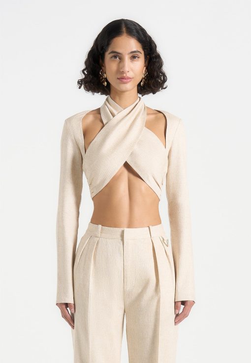 This natural linen bolero top combines the classic halter neck style with a modern, on trend sleeve overlay. Perfect for any occasion, this top is both chic and comfortable with its soft, breathable fabric. Add to your wardrobe with this on trend piece.